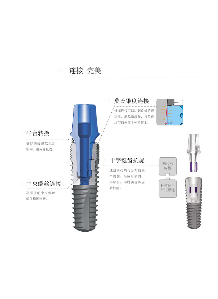 WEGO牙種植體采用了平臺轉(zhuǎn)換、莫氏錐度連接、十字鍵齒抗旋的結(jié)構(gòu)設(shè)計,種植體與基臺通過高強度的中央螺絲穩(wěn)固連接。該結(jié)構(gòu)充分體現(xiàn)了種植體與基臺之間的無間隙密封性能、較強的應力分散能力和抗旋性能。